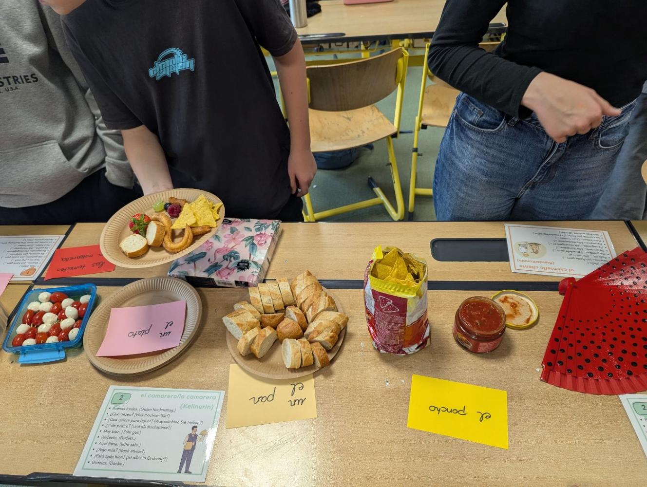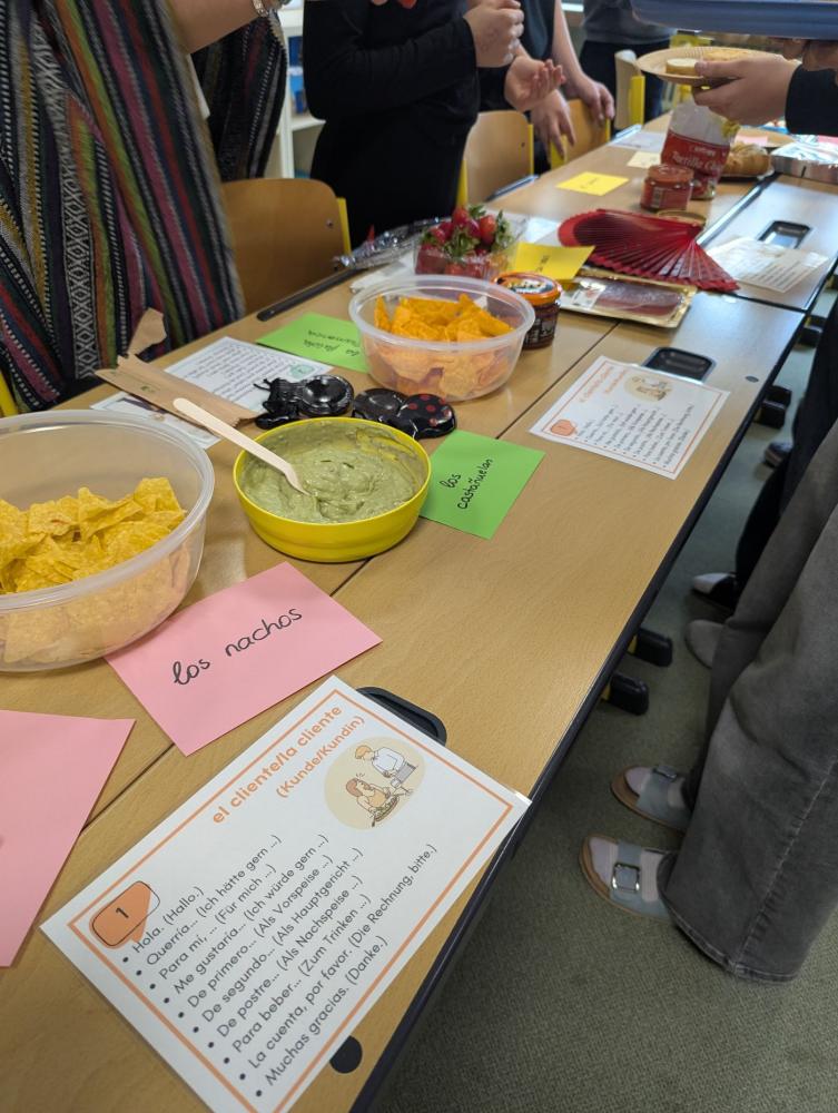 Doch nicht nur der Gaumen wurde gefordert – auch sprachlich gab es viel zu tun: In kleinen Rollenspielen schlüpften sie in die Rollen von Kund:innen und Kellner:innen. So musste eine Gruppe Essen und Getränke auf Spanisch bestellen, die andere mit einem freundlichen “Aquí tiene“ die passenden Gerichte servieren. Dann wurde gewechselt!