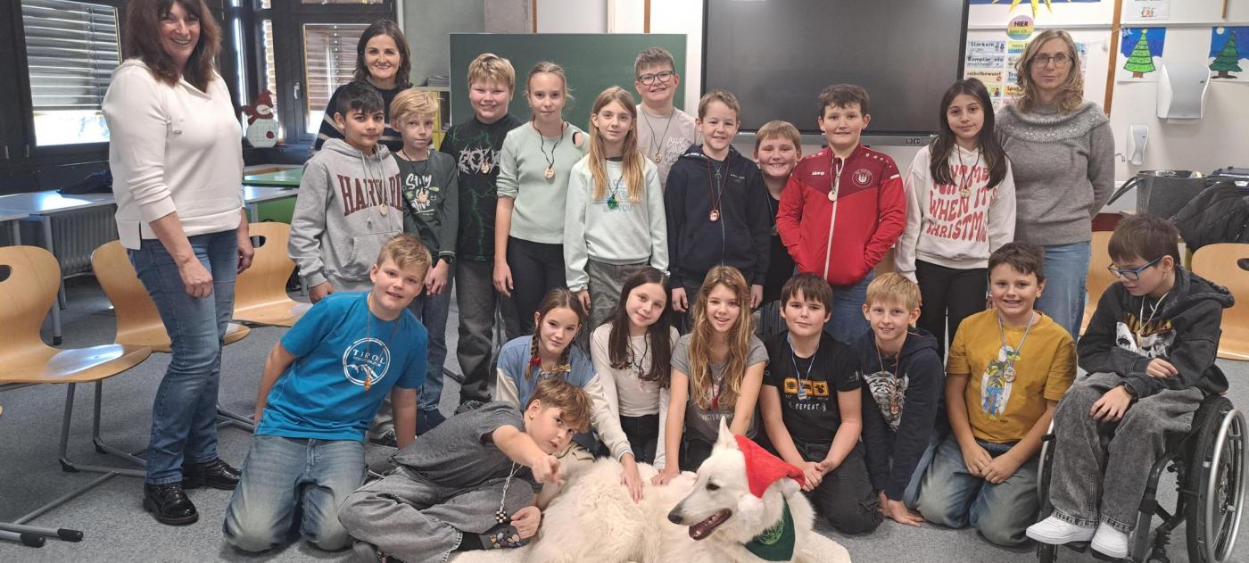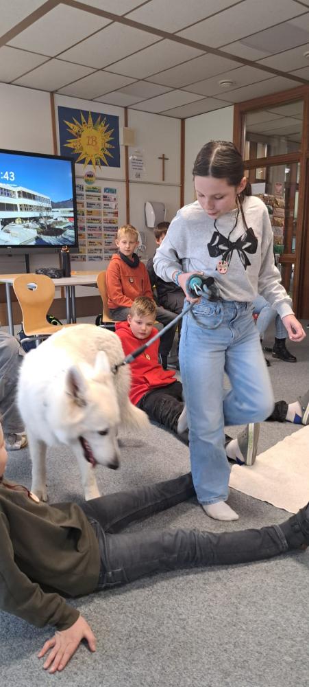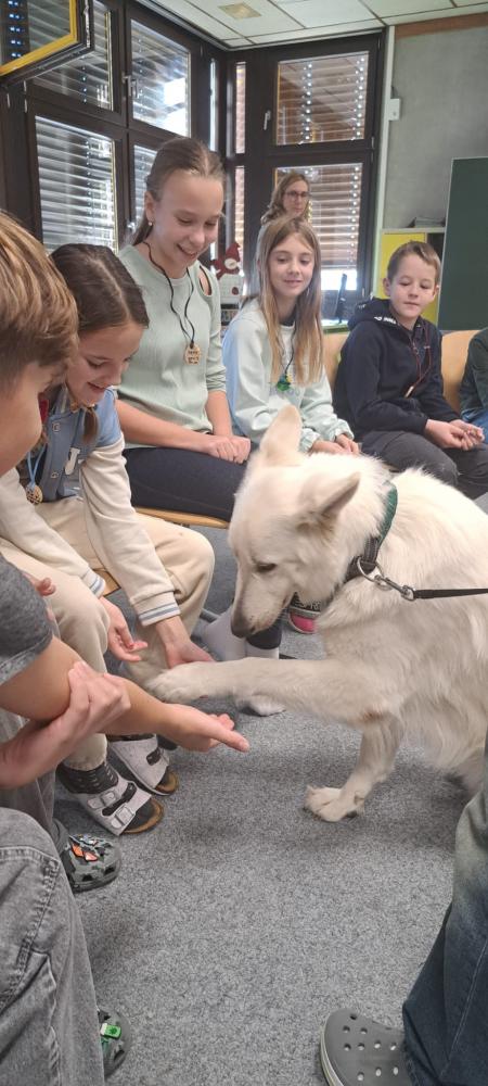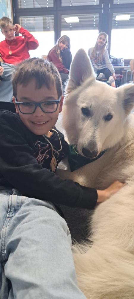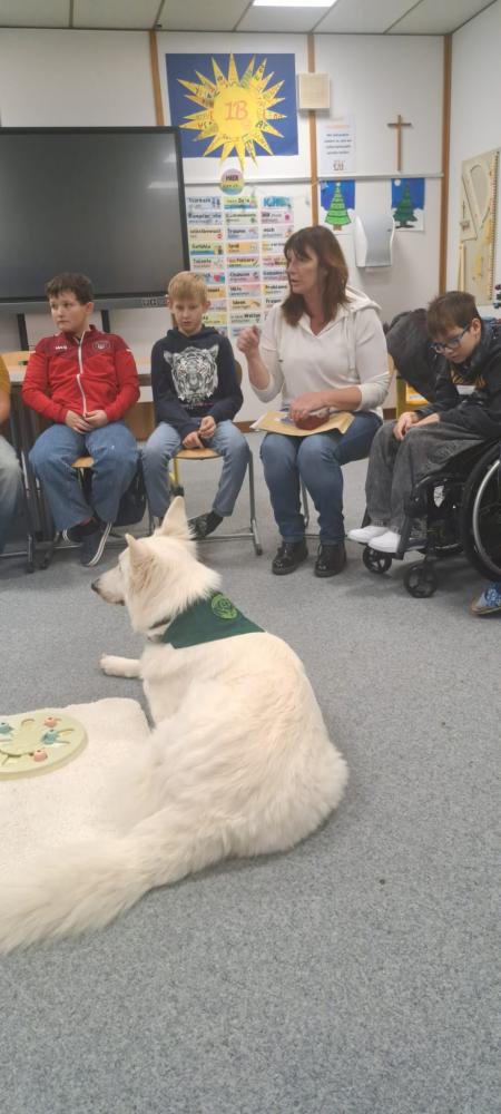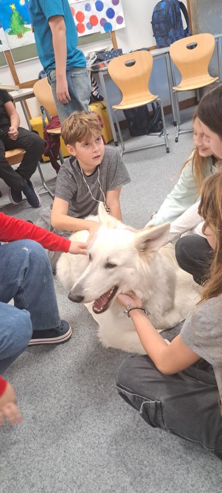 In diesem Schuljahr bekommt die Klasse 1B einmal im Monat Besuch von Sam, einem Schweizer Schäferhund. In diesen Stunden geht es um soziale Kompetenzen wie Rücksichtnahme und Einfühlungsvermögen und altersgerechtes Wissen über Hunde wird anschaulich vermittelt. Die Kinder führen Sam an der Leine und Kommandos wie „Sitz“, „Platz“ und „Nein“ werden geübt. Immer wieder wird Sam für seine Folgsamkeit und Geduld mit Leckerlis belohnt. Und auch das Kuscheln mit Sam kommt nicht zu kurz. Conny, die Hundeführerin, zeigte uns in der letzten Stunde stolz die Urkunde, denn Sam ist nun ausgebildeter Therapiehund. Natürlich gibt es auch immer eine kleine Aufgabe. Bis zum nächsten Besuch gestalten die Schüler einen Steckbrief über Sam.