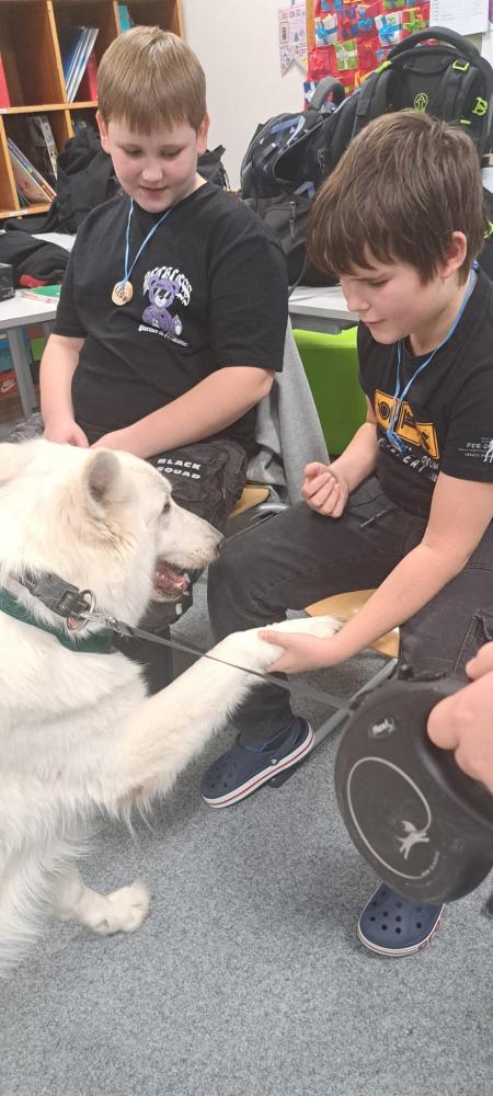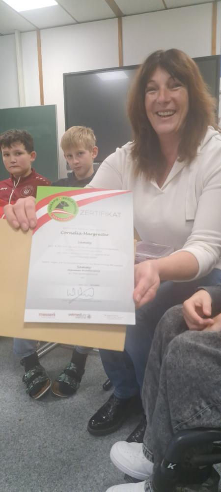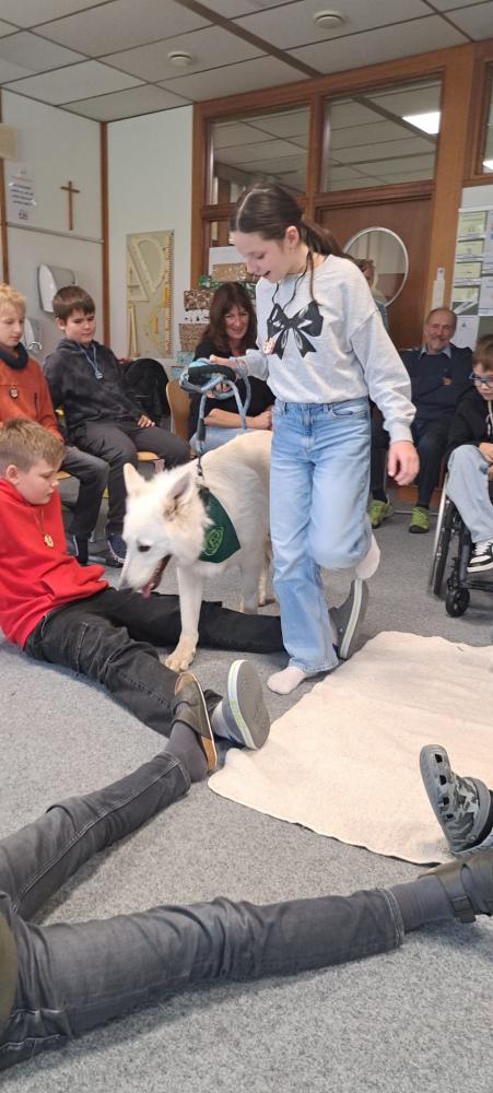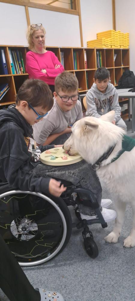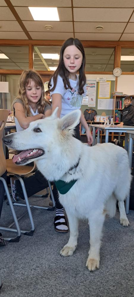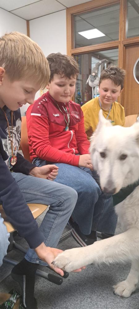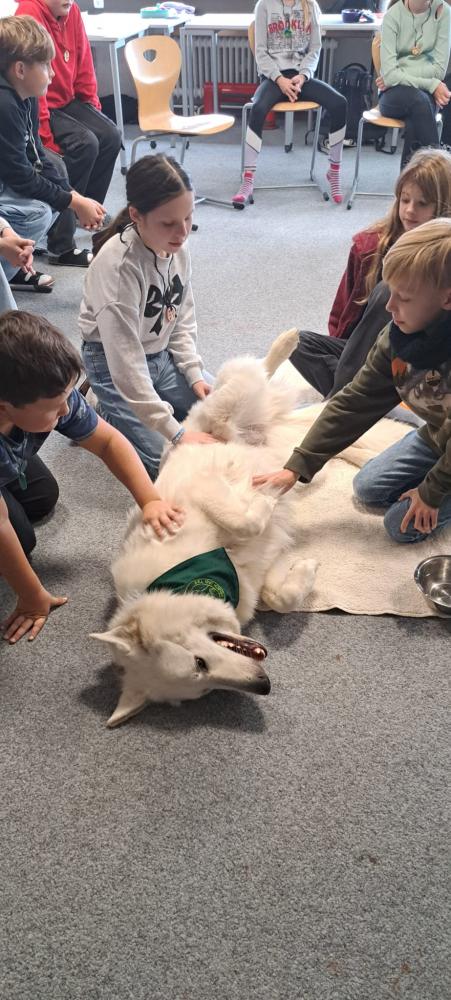 In diesem Schuljahr bekommt die Klasse 1B einmal im Monat Besuch von Sam, einem Schweizer Schäferhund. In diesen Stunden geht es um soziale Kompetenzen wie Rücksichtnahme und Einfühlungsvermögen und altersgerechtes Wissen über Hunde wird anschaulich vermittelt. Die Kinder führen Sam an der Leine und Kommandos wie „Sitz“, „Platz“ und „Nein“ werden geübt. Immer wieder wird Sam für seine Folgsamkeit und Geduld mit Leckerlis belohnt. Und auch das Kuscheln mit Sam kommt nicht zu kurz. Conny, die Hundeführerin, zeigte uns in der letzten Stunde stolz die Urkunde, denn Sam ist nun ausgebildeter Therapiehund. Natürlich gibt es auch immer eine kleine Aufgabe. Bis zum nächsten Besuch gestalten die Schüler einen Steckbrief über Sam.
